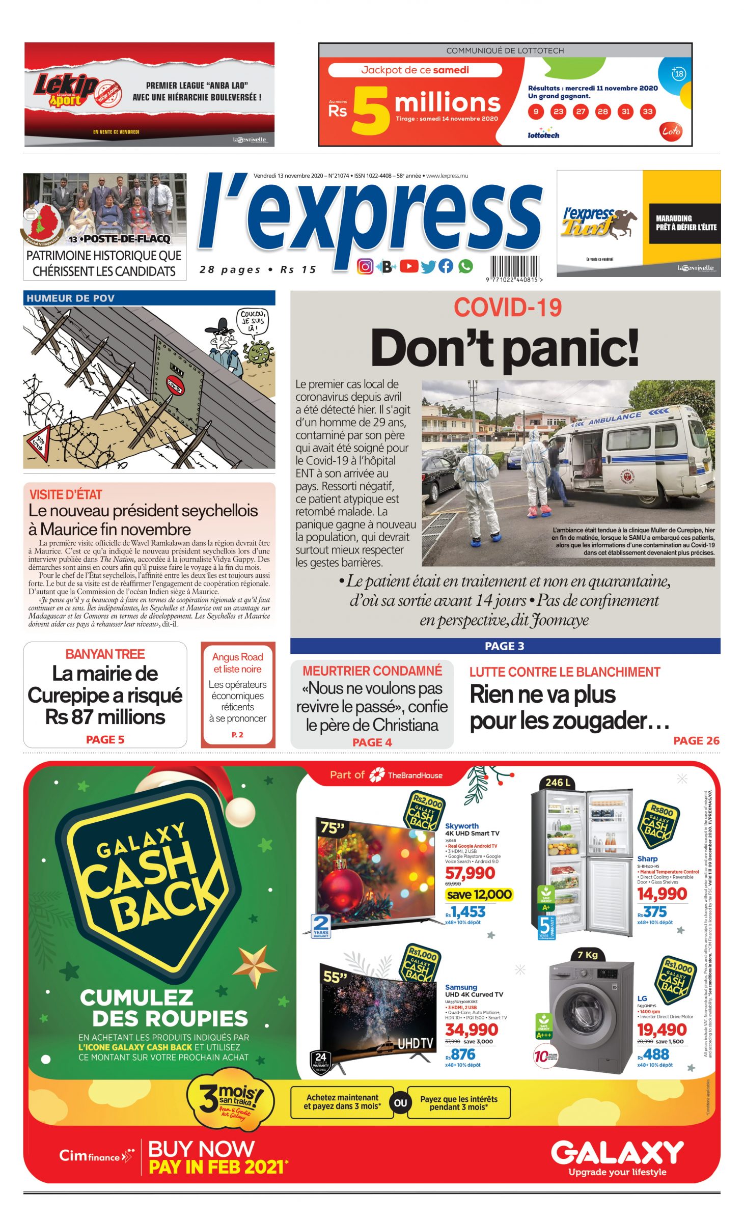En une de l'express;Covid-19: Don't panic! Autre titre;visite d’État:Le nouveau président seychellois à Maurice fin novembre.Et Lutte contre le blanchiment: rien ne va plus pour les zougader…