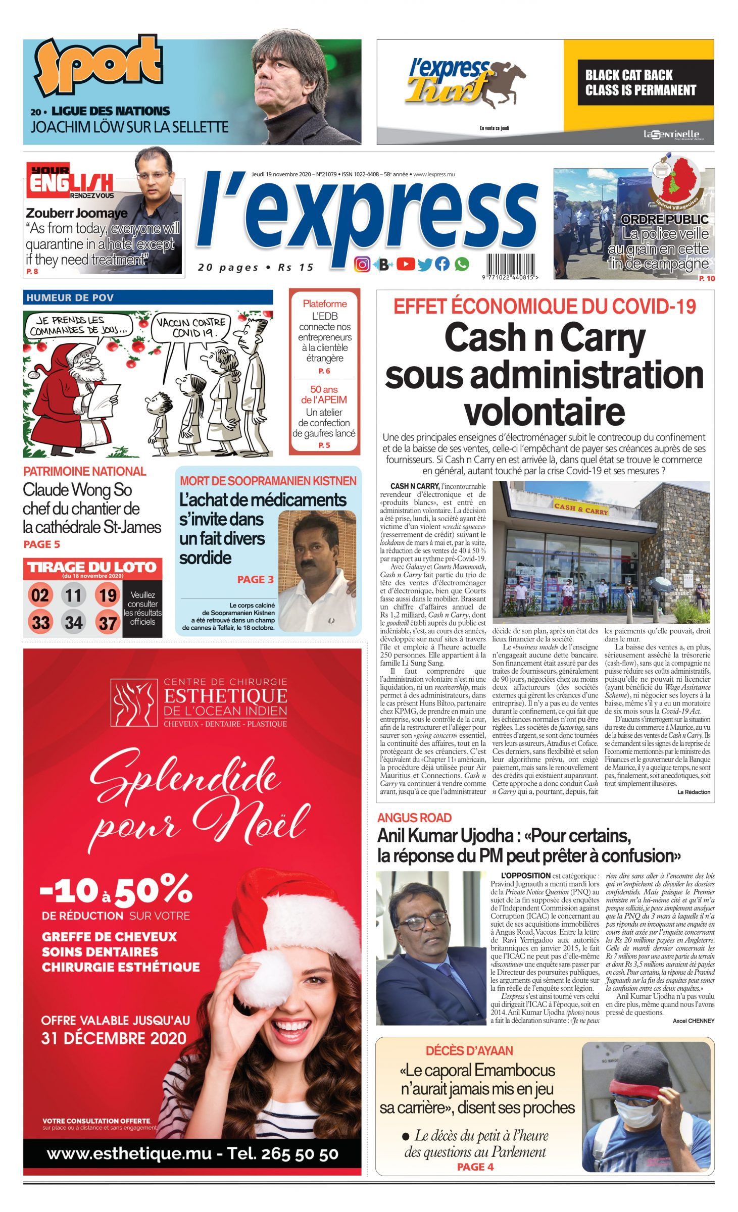 En une de l'express: Cash n Carry sous administration volontaire; Autre titre; Décès d’Ayaan: «Le caporal Emambocus n’aurait jamais mis en jeu sa carrière», disent ses proches.