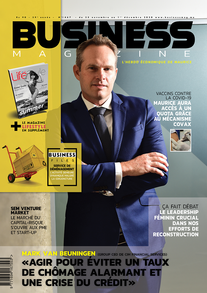 L’impact de la Covid-19 sur les entreprises reste très difficile à quantifier. Car les effets de la détérioration de l’économie ne seront ressentis que dans les mois à venir et ils dépendront eux-mêmes de la manière dont évolue la situation, observe le Group CEO de CIM Financial Services. Tout en adoptant une approche prudentielle, comme en témoigne le rehaussement du seuil des provisions pour créances douteuses à Rs 433,7 millions, le conglomérat remplit pleinement son rôle en soutenant les particuliers et les PME, fait remarquer Mark van Beuningen. C’est ce que vous retrouverez en couverture de Business Magazine ce mercredi 25 novembre 2020, un numéro accompagné du mensuel Lifestyle, à retrouver aux points de vente habituels et sur https://kiosk.lasentinelle.mu/presse/business-mag/