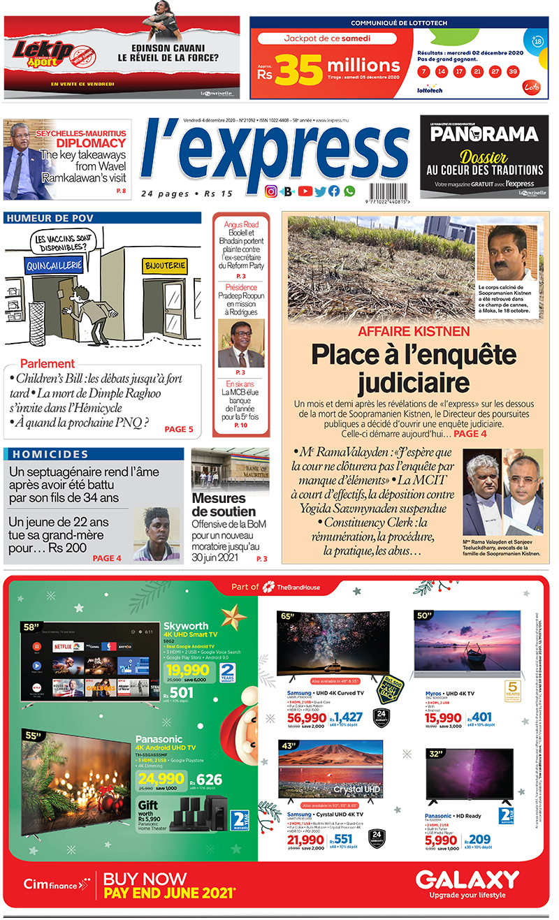 En une de l'express de ce vendredi 4 décembre 2020 ; Affaire Kistnen : Place à l’enquête judiciaire ; Autre titre: Mesures de soutien : Offensive de la BoM pour un nouveau moratoire jusqu’au 30 juin 2021.