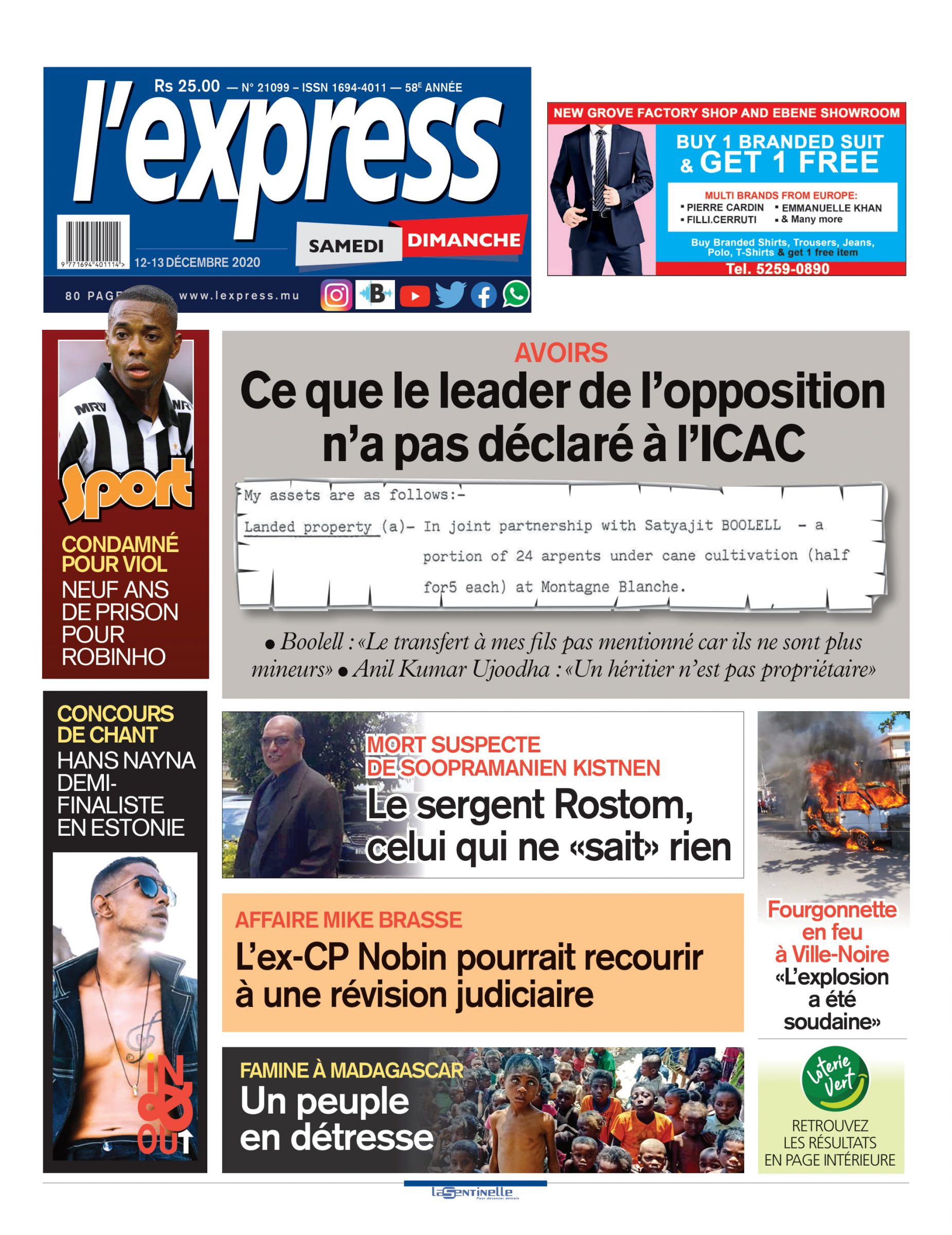 Votre journal deux en un de 80 pages en vente tout le week-end est en kiosque. Au coeur de l'actualité; Avoirs: Ce que le leader de l’opposition n’a pas déclaré à l’ICAC; Autre titre;Mort suspecte de Soopramanien Kistnen: Le sergent Rostom, celui qui ne «sait» rien.