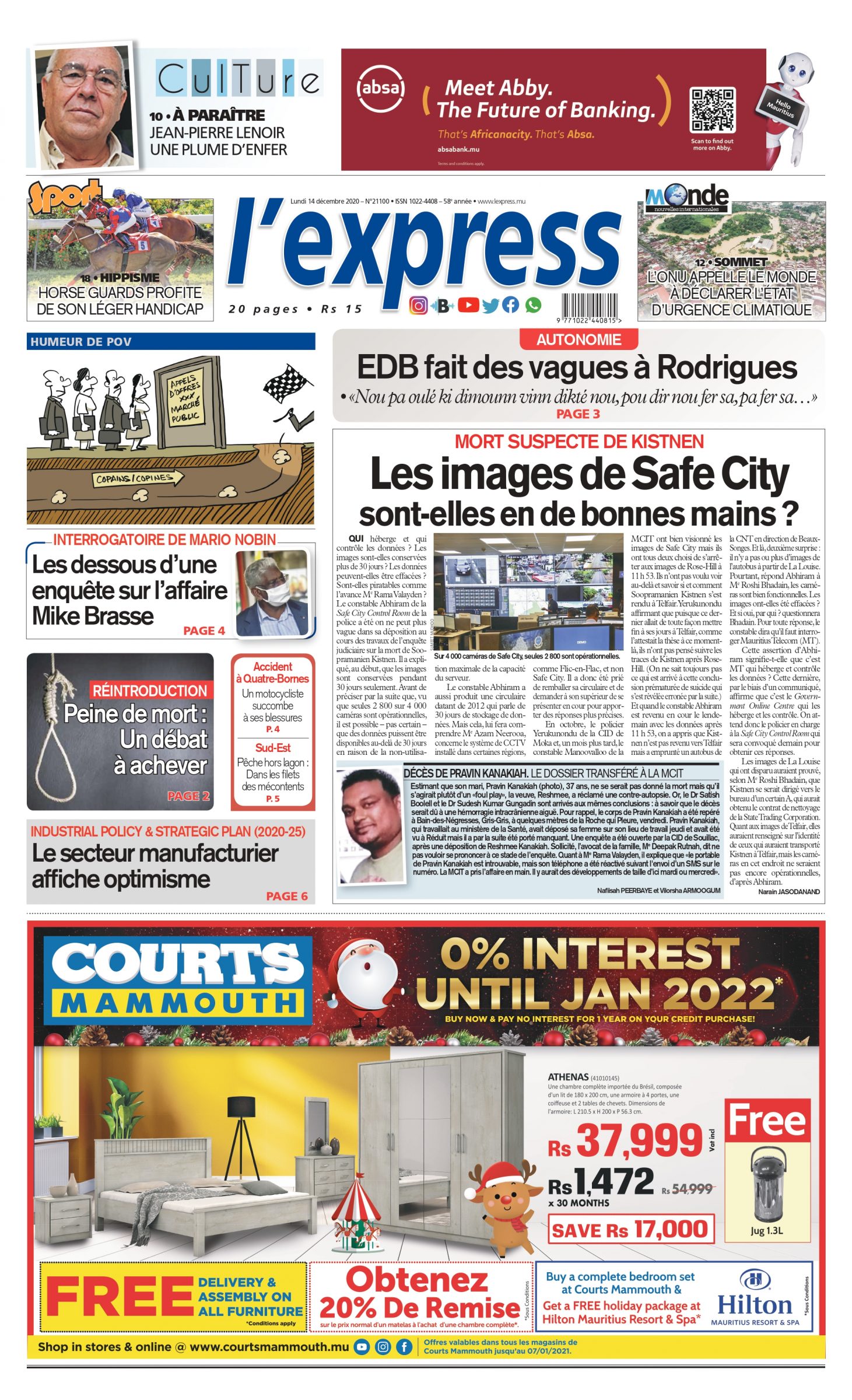 En une de l'express; Mort suspecte de Kistnen: Les images de Safe City sont-elles en de bonnes mains ? Autre titre; Les dessous d’une enquête sur l’affaire Mike Brasse.