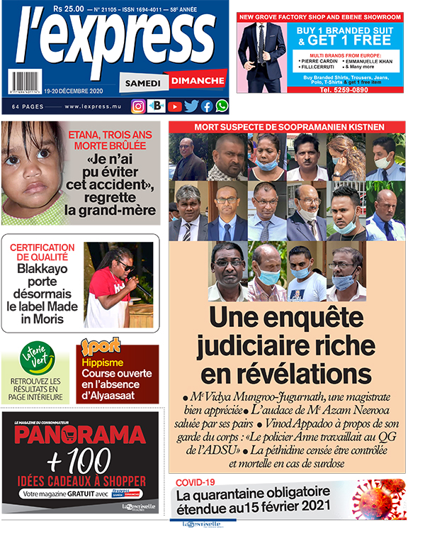 Votre journal deux en un de 64 pages en vente tout le week-end est en kiosque. Au coeur de l'actualité; «Mort suspecte de Soopramanien Kistnen: une enquête judiciaire riche en révélations» ; Autre titre : Etana, trois ans morte brûlée: «Je n’ai pu éviter cet accident», regrette la grand-mère.