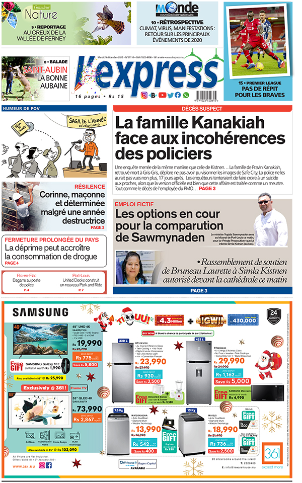 En une de l'express: Emploi fictif: les options en cour pour la comparution de Sawmynaden ; Autre titre: Décès suspect: La famille Kanakiah face aux incohérences des policiers.