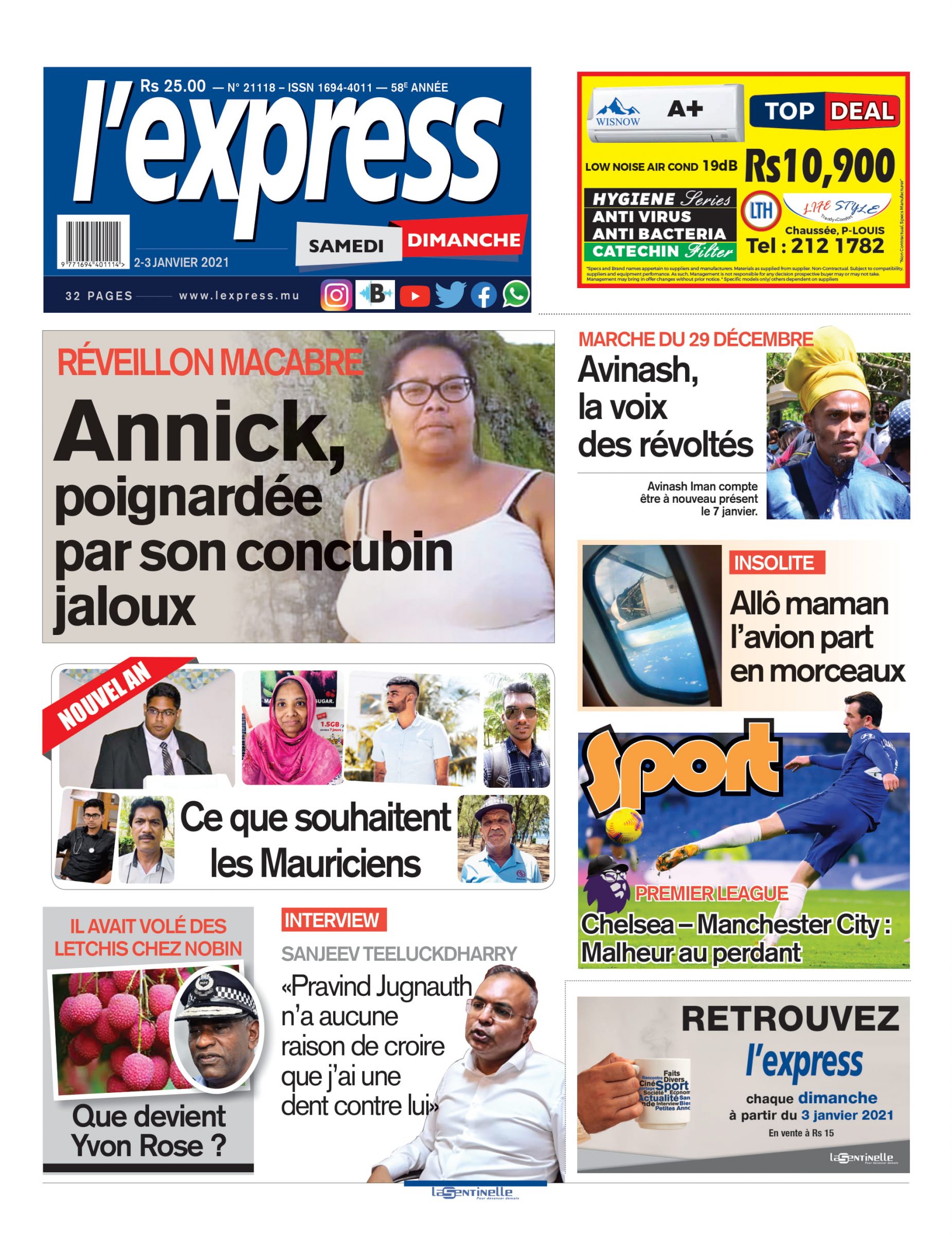 En une de l'express: Annick, poignardée par son concubin jaloux; Autre titre : Ce que souhaitent les Mauriciens