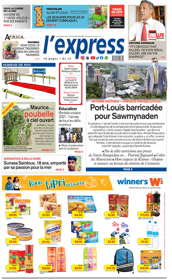 En une de l'express: «Private Prosecution»: Port-Louis barricadée pour Sawmynaden ; Autre titre: Rentrée scolaire 2020-2021: année de tous les défifis imprévus.