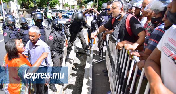 À l’issue de la journée, trois interpellations auront marqué les esprits. La première : celle de Jean Paul Didier Picon, fils de l’ancien arbitre Sydney Picon. Il se trouvait dans une «restricted area» et faisait du bruit, selon la police. Raison pour laquelle il a été arrêté sous les yeux dépités des autres personnes présentes. La deuxième personne arrêtée est une des sœurs Brasse, Karina, suivant un accrochage avec le syndicaliste Ivor Tan Yan. La présence de celle qui avait fait le buzz sur Facebook lors du confinement pour avoir «fait une virée en scooter jusqu’à l’île-aux-Cerfs» n’a pas plu aux personnes présentes. Ces dernières scandaient : «Éta travayer MSM.» Par la suite, une autre femme a été interpellée et conduite au poste de police de Pope Hennessy, car elle se trouvait dans une «restricted area». Malgré les directives de la police, celle qui en plus ne portait pas de masque a refusé d’obtempérer. «Simé piblik sa, pou nou tou Morisien sa, mo pa pou bouzé dépi isi», a-t-elle martelé. Avant qu’elle soit forcée de monter à bord d’un véhicule de police. Contacté à ce sujet, l’inspecteur Shiva Coothen, du Police Press Office, devait déclarer que la femme en question n’a pas été arrêtée. «Mo pa vréman o kouran dé sa zafer-la parski mo ti dan lakour mwa osi, mé madam-la pann arété.» D’ajouter que les policiers l’ont conduite au poste pour noter son adresse. Elle sera verbalisée pour non-port du masque, a souligné l’inspecteur Coothen. «Sé pa enn arestasion.»
