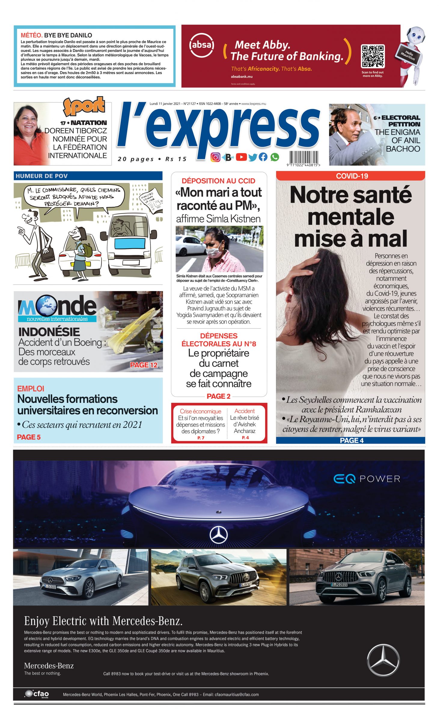 En une de l'express:«Mon mari a tout raconté au PM», affirme Simla Kistnen;Autre titre: Notre santé mentale mise à mal.
