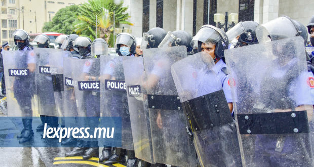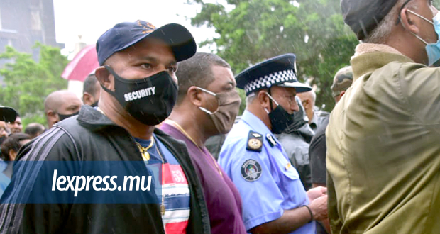 Venant de la rue Lislet Geoffroy, ces hommes masqués ont circulé librement malgré le déploiement des forces de l’ordre aux abords de l’institution judiciaire. Venus soutenir le ministre, ils ne voulaient pas se faire prendre en photo et ont même demandé aux journalistes d’éviter de les photographier sur un ton menaçant. Cette manifestation visiblement tenue pour passer un message et intimider a fait réagir les autorités, qui ont dépêché sur le champ des éléments de la SSU, équipés de matraques et de boucliers.