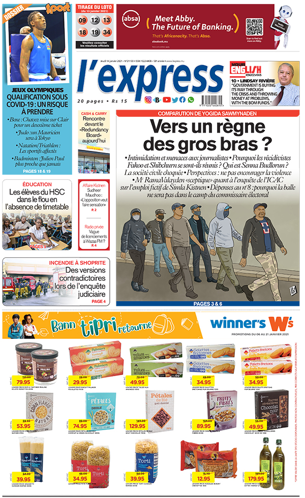 En une de l'express: Comparution de Yogida Sawmynaden: vers un règne des gros bras ? Autre titre: Affaire Kistnen: les «Avengers» considérés comme une création de l’opposition.