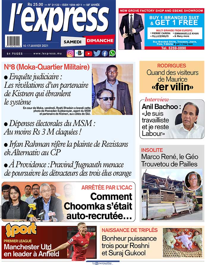 En une de l'express de ce samedi 16 janvier 2021: No 8 (Moka-Quartier Militaire) - Enquête judiciaire : Les révélations d’un partenaire de Kistnen qui ébranlent le système ; Autre titre ; Arrêtée par l’ICAC: Comment Choomka s’était auto-recrutée…