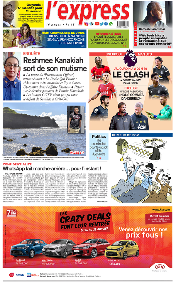 En une de l'express: Enquête: Reshmee Kanakiah sort de son mutisme ; Autre titre: Enquête judiciaire: focus sur les dessous des contrats publics au n°8.