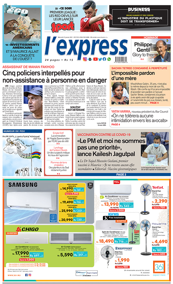 En une de l'express : Assassinat de Manan Fakhoo: cinq policiers interpellés pour non-assistance à personne en danger ; Autre titre: Sachin Tetree condamné à perpétuité: l’impossible pardon d’une mère.