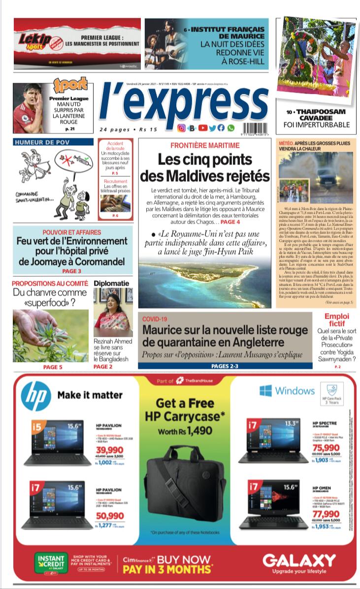 En une de l'express : Frontière maritime: les cinq points des Maldives rejetés; Autre titre: Covid-19: Maurice sur la nouvelle liste rouge de quarantaine en Angleterre