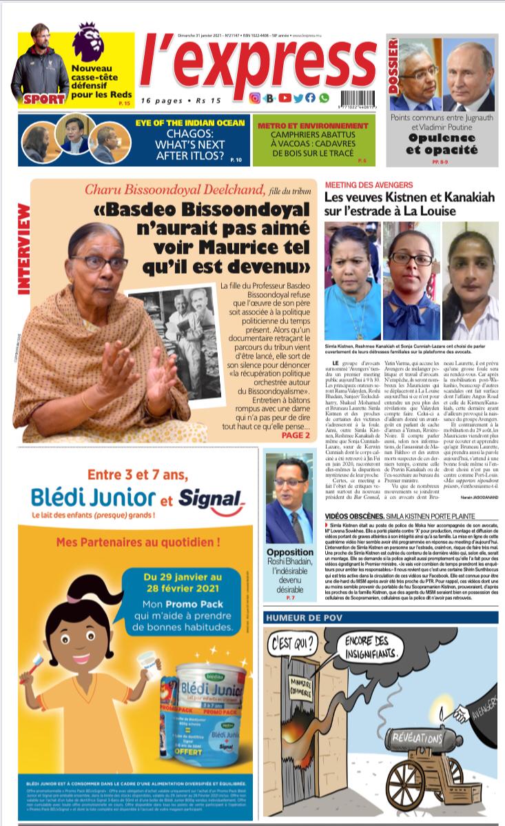 En une de l'express: Charu Bissoondoyal Deelchand: «Basdeo Bissoondoyal n’aurait pas aimé voir Maurice tel qu’il est devenu»; Autre titre: Meeting des Avengers: Les veuves Kistnen et Kanakiah sur l’estrade à La Louise