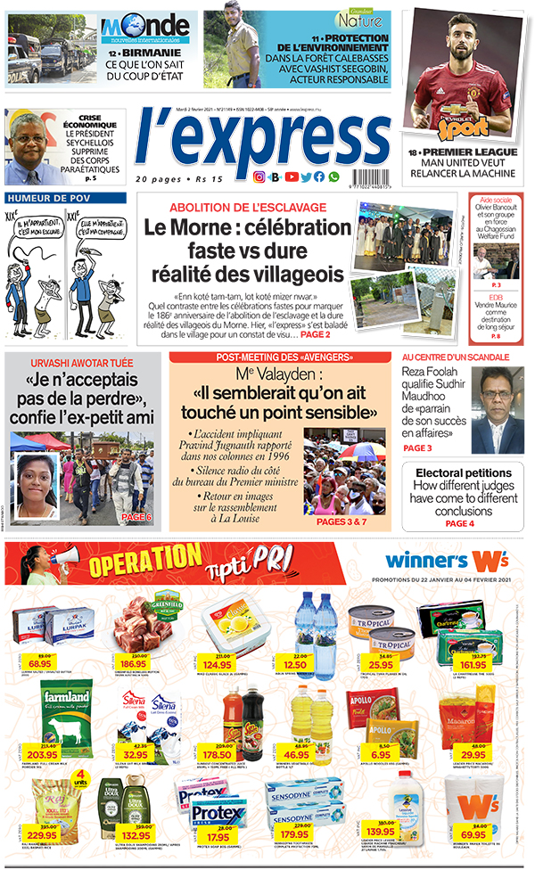 En une de l'express : Le Morne: célébration faste vs dure réalité des villageois ; Autre titre : Me Valayden: «Il semblerait qu’on ait touché un point sensible».