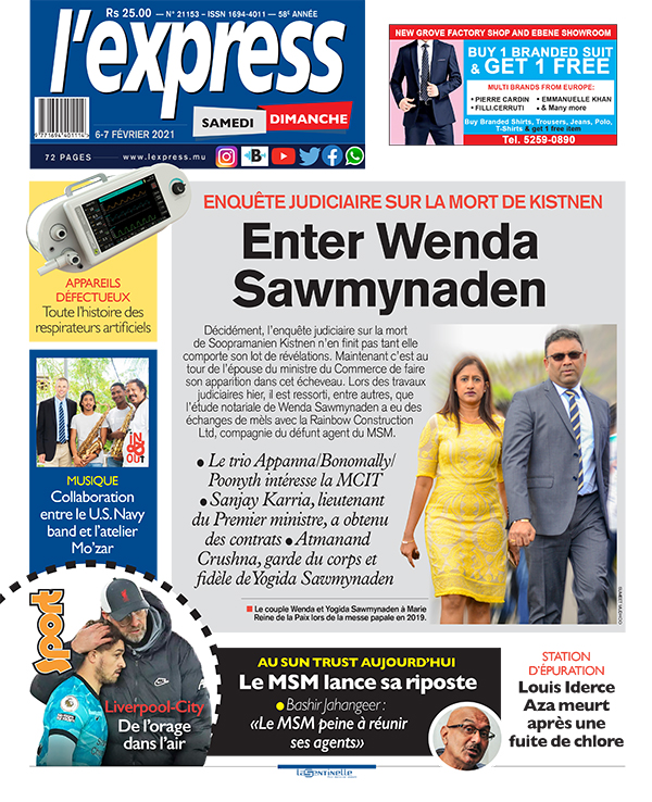 En une de l'express: Enquête judiciaire sur la mort de Kistnen: enter Wenda Sawmynaden ; Autre titre: Au Sun Trust aujourd’hui: le MSM lance sa riposte.
