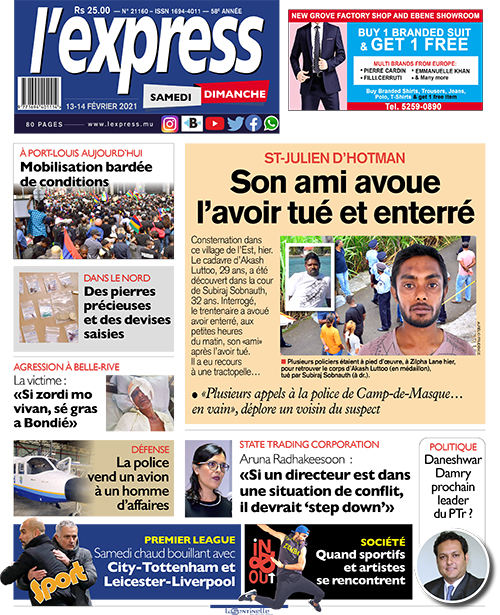 En une de l'express: St-Julien d’Hotman : Son ami avoue l’avoir tué et enterré ; Autre titre: À Port-Louis aujourd’hui : Mobilisation bardée de conditions.