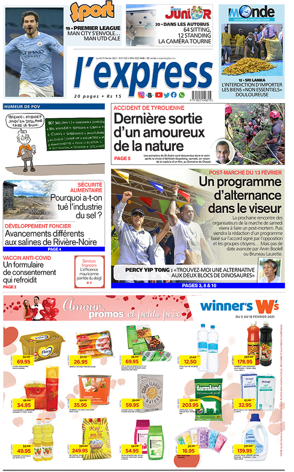 En une de l'express: Accident de tyrolienne: dernière sortie d’un amoureux de la nature ; Autre titre: Post-marche du 13 février: un programme d’alternance dans le viseur.
