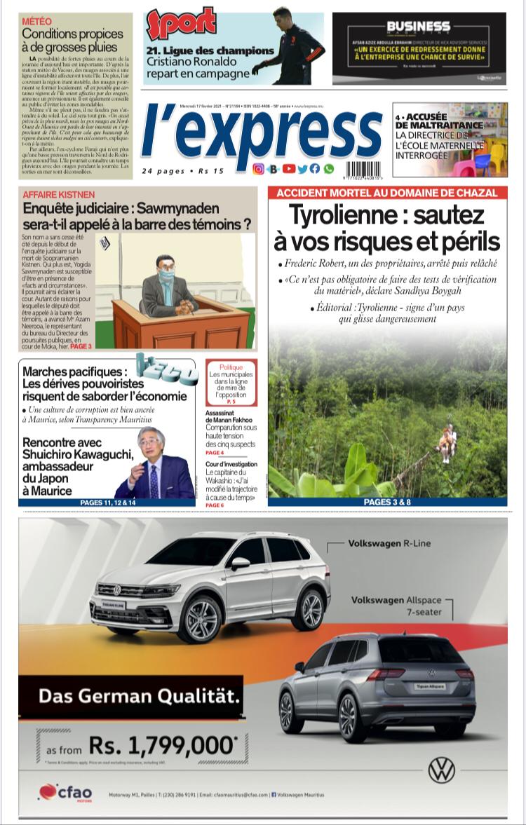 En une de l'express: Accident mortel au Domaine de Chazal: Tyrolienne: sautez à vos risques et périls; Autre titre: Affaire Kistnen: Enquête judiciaire : Sawmynaden sera-t-il appelé à la barre des témoins ?