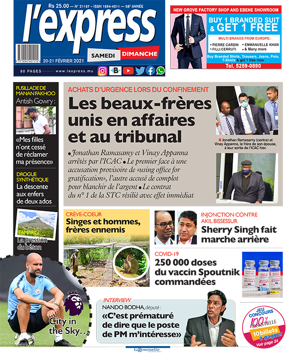 Au coeur de l'actualité: Achats d’urgence lors du confinement: les beaux-frères unis en affaires et au tribunal ; Autre titre :Nando Bodha: «C’est prématuré de dire que le poste de PM m’intéresse».