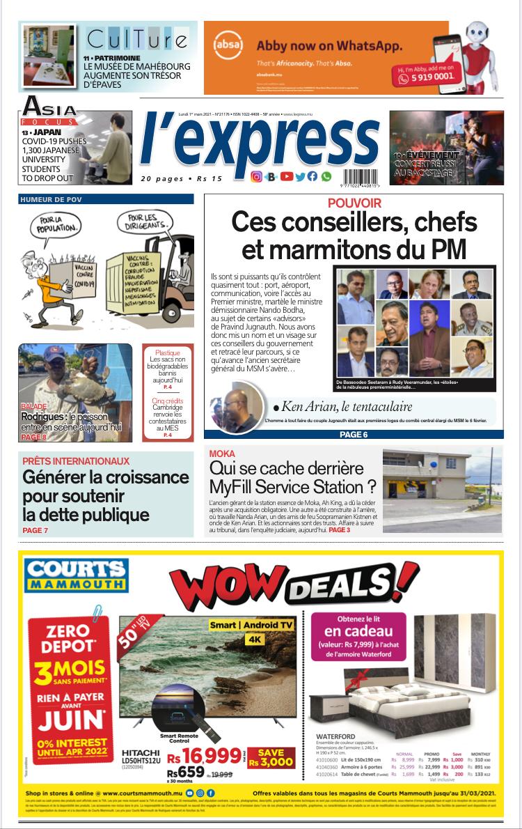 En une de l'express : Pouvoir : Ces conseillers, chefs et marmitons du PM; Autre titre : Moka: Qui se cache derrière MyFill Service Station ?