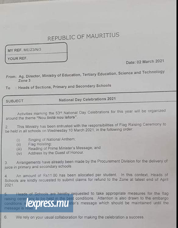 En marge de l’événement, le ministère de l’Éducation indique qu’un montant de Rs 11 roupies sera alloué par élève pour la distribution traditionnelle de jus. Les écoles auront donc à payer pour ces frais qui leur seront remboursés par le ministère.
