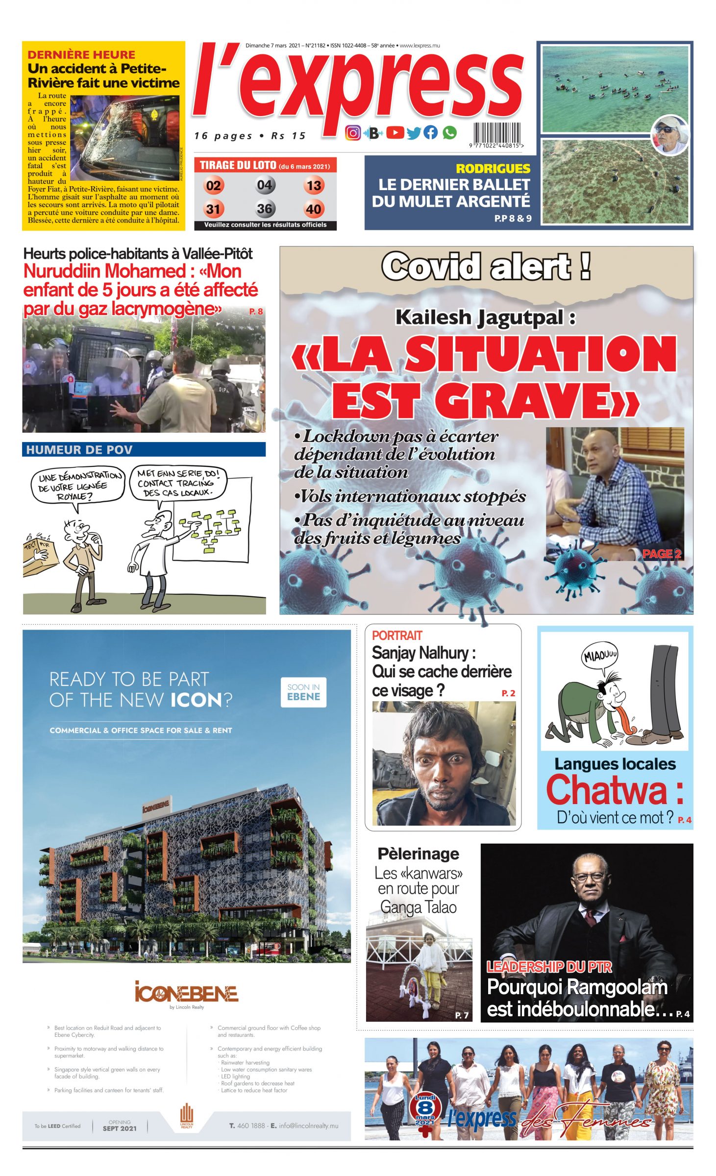 En une de l'express;Kailesh Jagutpal : «la situation est grave» ; Autre titre: Un accident à Petite-Rivière fait une victime