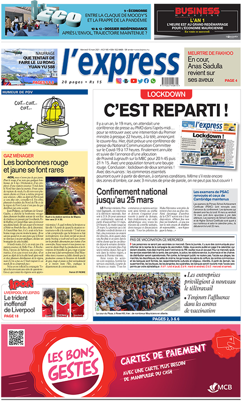 Il y a un an, le 19 mars, on attendait une conférence de presse au PMO dans l’après-midi… pour se retrouver avec une intervention du Premier ministre à presque 22 heures, à la télé, annonçant le couvre-feu. Hier, était prévue une conférence de presse du National Communication Committee sur le Covid-19 à 17 heures. Finalement annulée et suivie de l’annonce d’une allocution de Pravind Jugnauth sur la MBC pour 20 h 45 puis 21 h 15. Avec une population tenant une bougie rouge. Conclusion : lockdown de deux semaines ! Avec des nuances : les commerces essentiels pourront ouvrir à partir de demain, à certaines conditions. Même s’il reste encore des zones d’ombre, car avec 3 minutes de prise de parole, on ne peut pas tout couvrir !