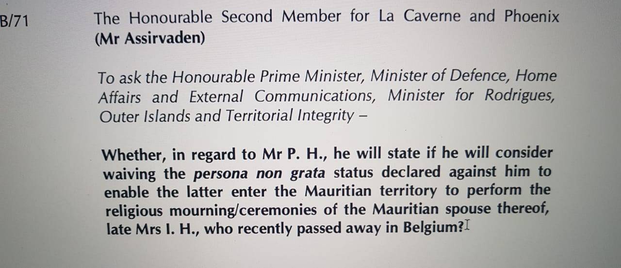 Lors de la prochaine séance parlementaire, le mardi 30 mars, le député du Parti travailliste, Patrick Assirvaden, interrogera le Premier ministre sur l’interdiction d’accès au territoire mauricien qui pèse sur Patrick Hofman. L’ex-commandant de bord d’Air Mauritius paye encore les frais d’un amendement apporté à l’Immigration Act en 2019 et a été déclaré Persona Non Grata par Pravind Jugnauth. Mais la semaine dernière, Patrick Hofman a perdu son épouse, Isabelle L’Olive-Hofman, qui est décédée d’une rupture d’anévrisme. Cette ancienne hôtesse de l’air mauricienne s’était retrouvée contrainte de s’exiler au Belgique en 2019 pour pouvoir vivre auprès de son époux. Le député rouge veut savoir si le Premier ministre va considérer une levée de l’interdiction qui pèse sur Patrick Hofman pour qu’il puisse venir assister à des rituels funéraires en hommage à son épouse.