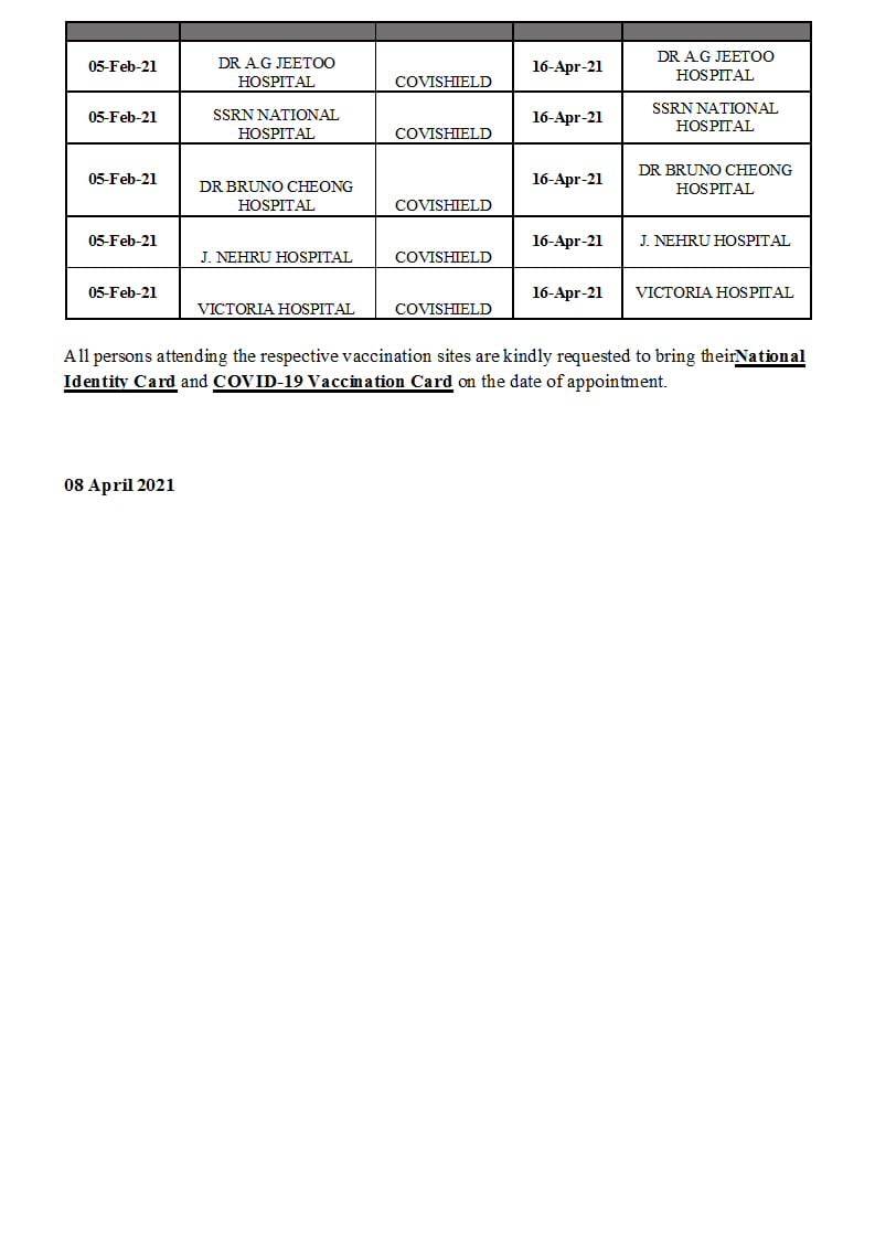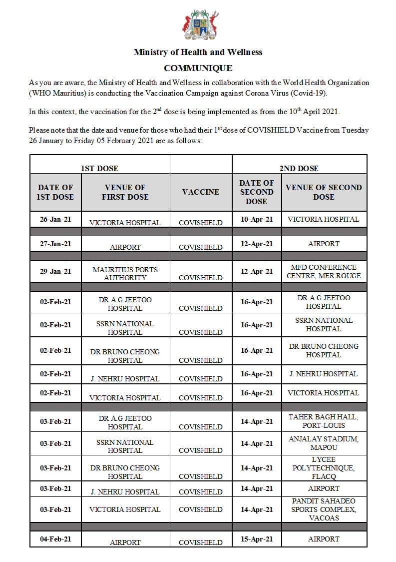 Ce jeudi 8 avril, le ministère de la Santé a émis un communiqué pour informer la population que la deuxième dose de ceux qui ont été vaccinés à l’AstraZeneca Covishield entre le 26 janvier au 5 février débutera le 10 avril prochain.
