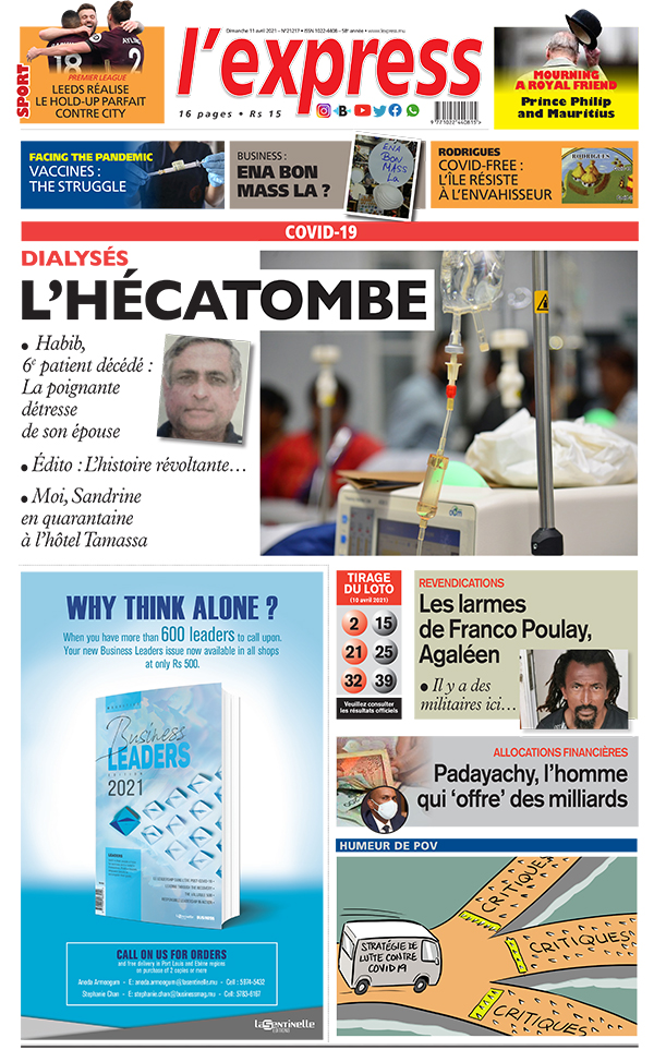 En une de l'express: Covid-19 - Dialysés: l’Hécatombe ; Autre titre: Allocations financières: Padayachy, l’homme qui ‘offre’ des milliards.