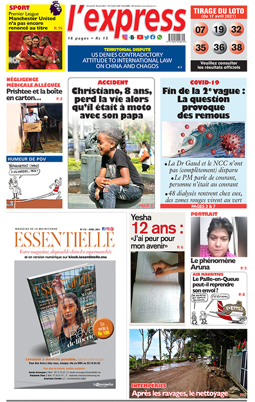 En une de l'express: Accident : Christiano, 11 ans, perd la vie alors qu’il était à moto avec son papa ; Autre titre: COVID-19 - Fin de la 2e vague : La question provoque des remous.