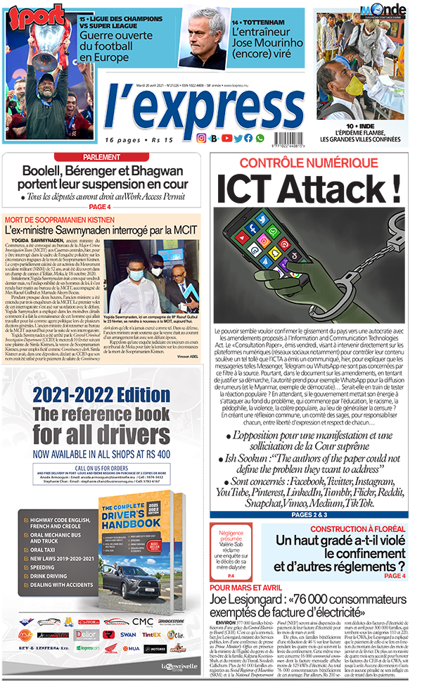 En une de l'express: Contrôle numérique: ICT Attack ! Autre titre: Suspendus du Parlement: Boolell, Bérenger et Bhagwan portent leur suspension en Cour suprême.