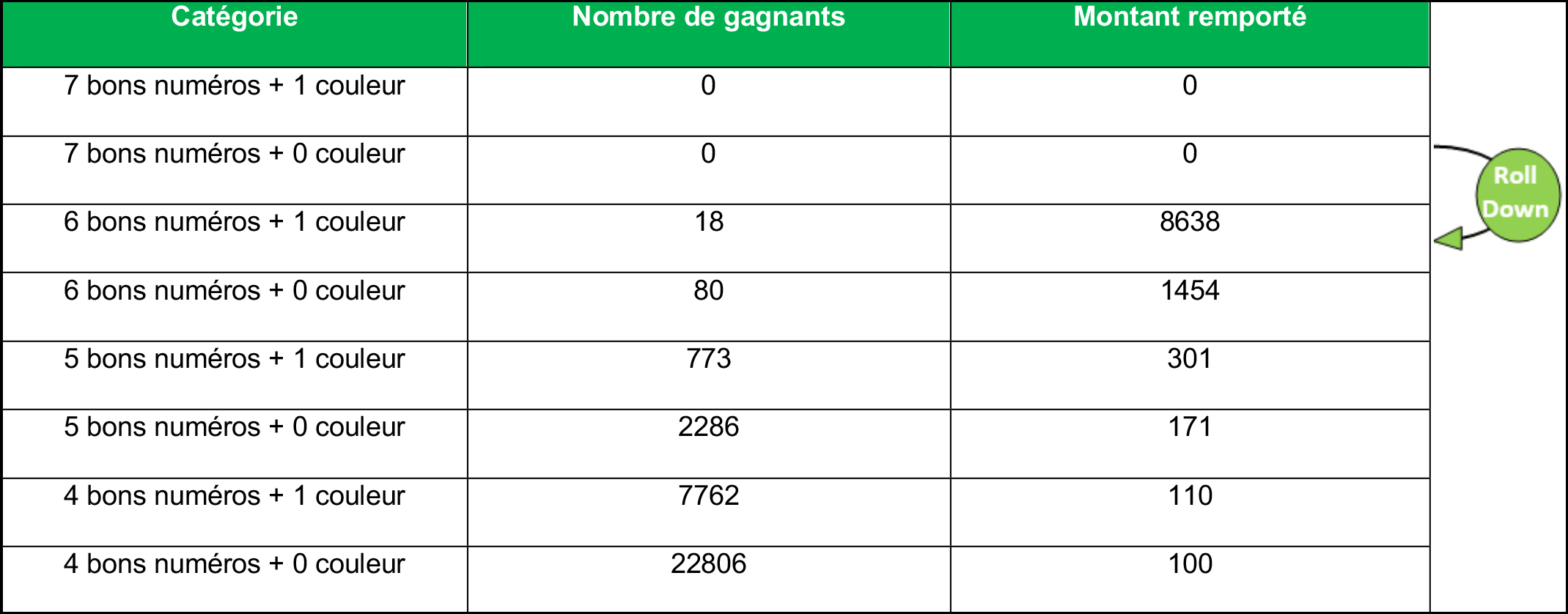 Puisqu’aucun joueur n’a trouvé la combinaison gagnante pour ce 21e tirage de la Loterie Vert, le roll over s’appliquant, le gros lot du vendredi 30 avril 2021 passe donc à approximativement Rs 56 millions.