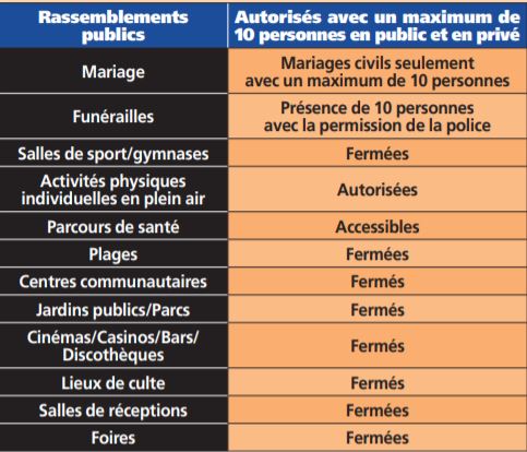 Le 15 juin 2020, les espaces publics tels que les plages, les parcs et jardins, les cinémas, les casinos, les centres communautaires, les foires ou encore les complexes sportifs et salles de sport étaient de nouveau accessibles. Seules les courses hippiques avaient repris à huis clos, comme cette année. Mais ce samedi, ces espaces resteront fermés au public. Idem pour les salles de réception et les lieux de culte. Il faudra attendre une amélioration de la situation sanitaire au pays avant d’envisager la levée de l’interdiction dans ces endroits. Pour les restaurants, seules les commandes de repas à emporter (en takeaway) sont acceptées pour cette phase de déconfinement. Les cabinets médicaux rouvriront leurs portes et les opticiens, les dentistes du privé, ainsi que les vétérinaires peuvent à nouveau travailler. Les concerts, les activités socioculturelles et les sports collectifs sont toujours interdits.