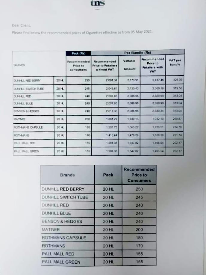 Coup dur pour les fumeurs. A partir de demain, le prix des cigarettes sera plus élevé. Une hausse variant entre Rs 5 et Rs 10 sera appliquée sur chaque paquet de 20 cigarettes. C'est le paquet de la marque Matinée qui enregistre une montée du prix plus conséquente comme suit: