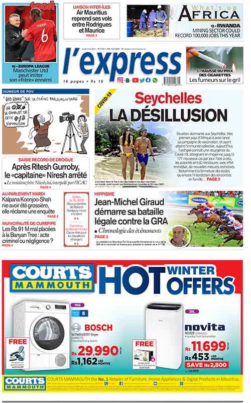 En une de l'express: COVID-19 – Seychelles : La désillusion; Autre titre, Hippisme : Jean-Michel Giraud démarre sa bataille légale contre la GRA.