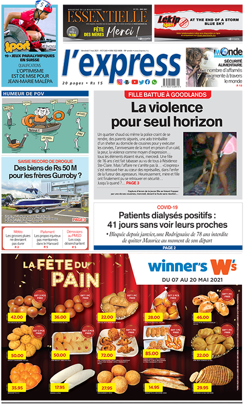 En une de l'express: Fille battue à Goodlands : La violence pour seul horizon ; Autre titre, Saisie record de drogue : Des biens de Rs 50 M pour les frères Gurroby ?