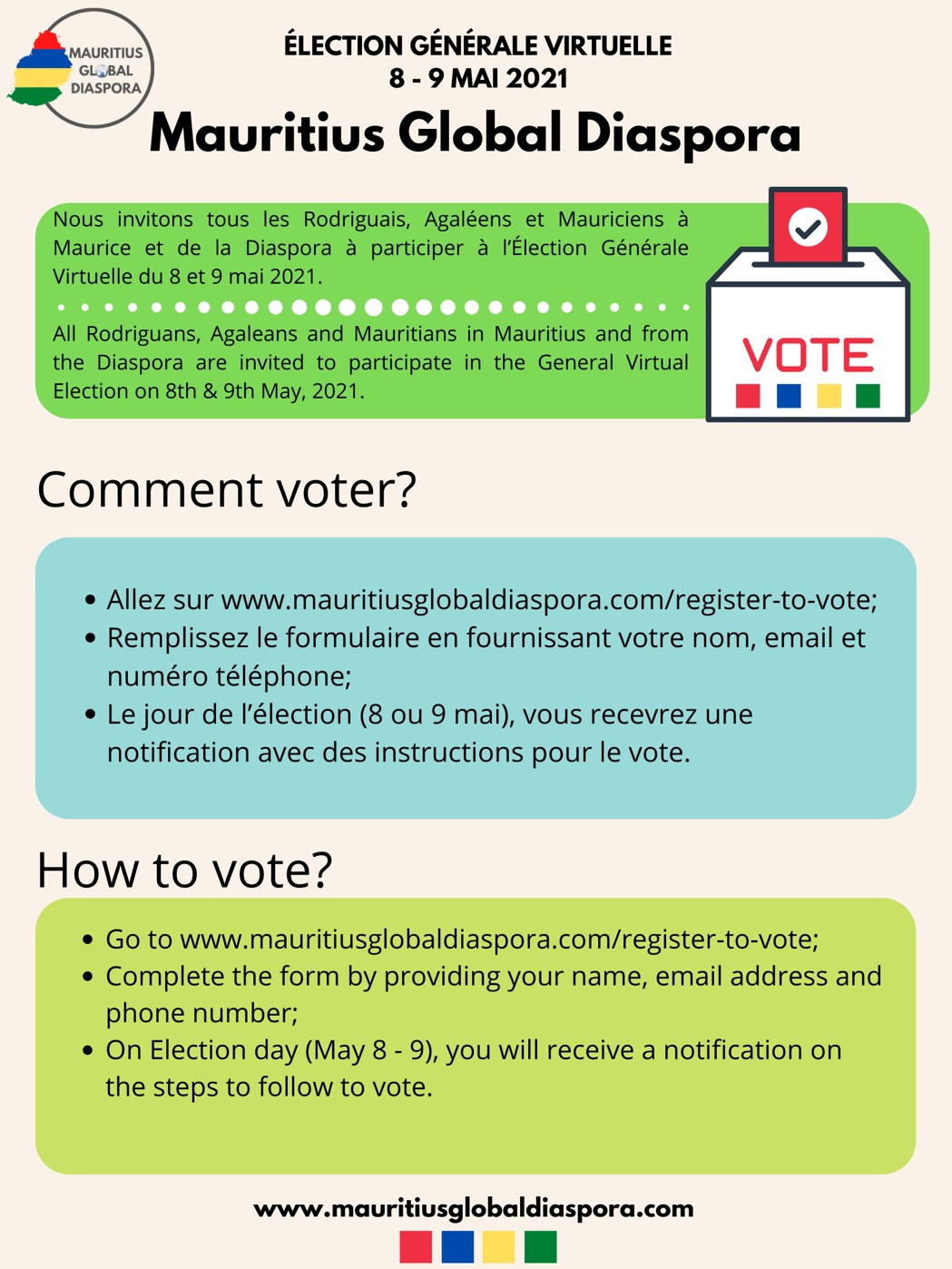 Un premier vote électronique de la diaspora a lieu ce week-end pour élire le parti qui serait le plus apte à diriger le pays. Les électeurs mauriciens (d’ici ou d’ailleurs) peuvent voter en utilisant le lien suivant: tinyurl.com/MGDelections