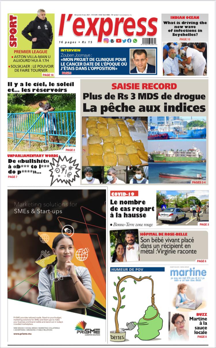 En une de l'express: Saisie de drogue record: La pêche aux indices; Autre titre: Covid-19: Le nombre de cas repart à la hausse.