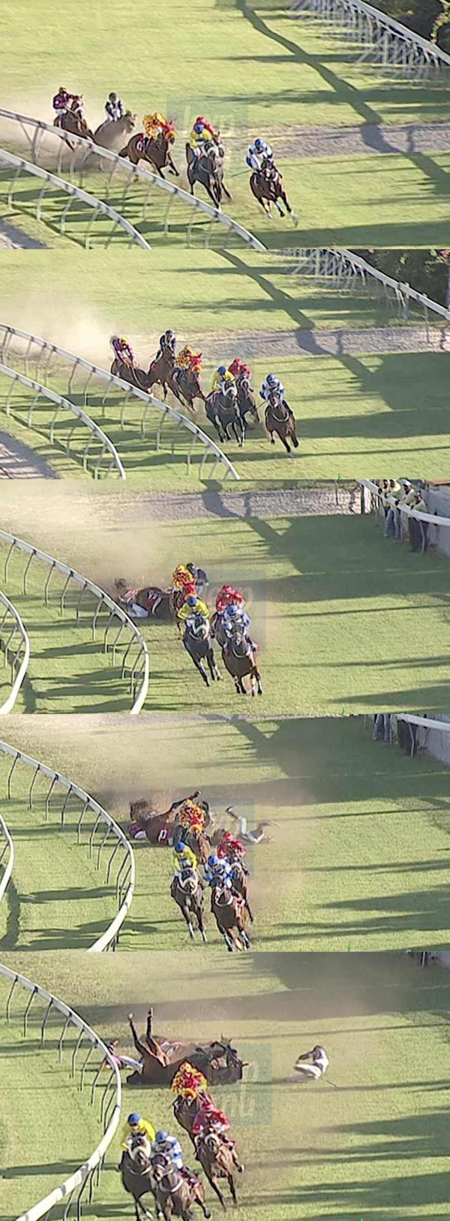Rule The Night, qui le suivait et qui s’apprêtait à passer à son intérieur, devait marcher sur ses talons avant de chuter à son tour. Juglall fut projetée à terre avec une rare violence. Reste à confirmer si Juglall a été touché par l’un des deux chevaux, voire par les deux.