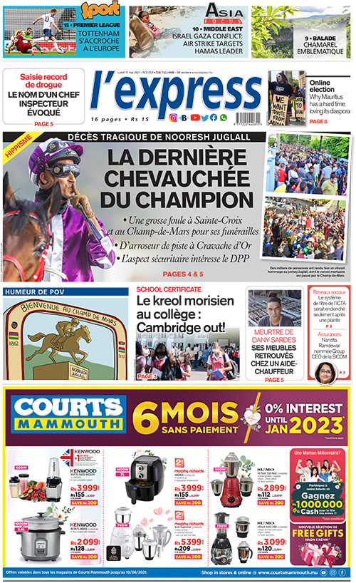 En une de l'express: Décès tragique de Nooresh Juglall: La dernière chevauchée du champion ; Autre titre: School Certificate : Le kreol morisien au collège : Cambridge out!