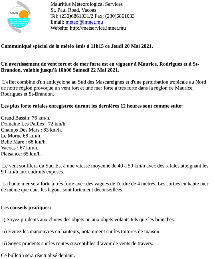 Des rafales de plus de 60 km/h ont été enregistrées dans plusieurs régions de l’île, ce jeudi 20 mai. La station météorologique de Vacoas a émis un communiqué spécial, appelant à prendre des précautions.