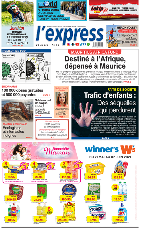 En une de l'express: Mauritius Africa Fund : Destiné à l’Afrique, dépensé à Maurice ; Autre titre: Faits de société - Trafic d’enfants: Des séquelles qui perdurent.