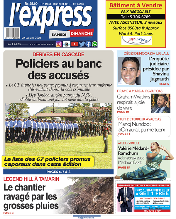 En une : Dérives en cascade: Policiers au banc des accusés ; Autre titre: Legend Hill à Tamarin: le chantier ravagé par les grosses pluies.