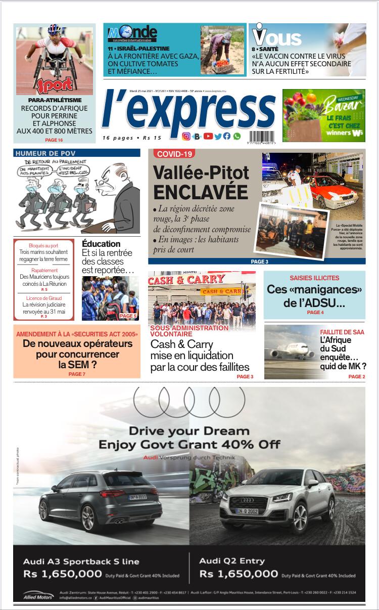 En une de l'express: Covid-19: Vallée-Pitot enclavée; Autre titre: Sous administration volontaire: Cash & Carry mise en liquidation par la cour des faillites.