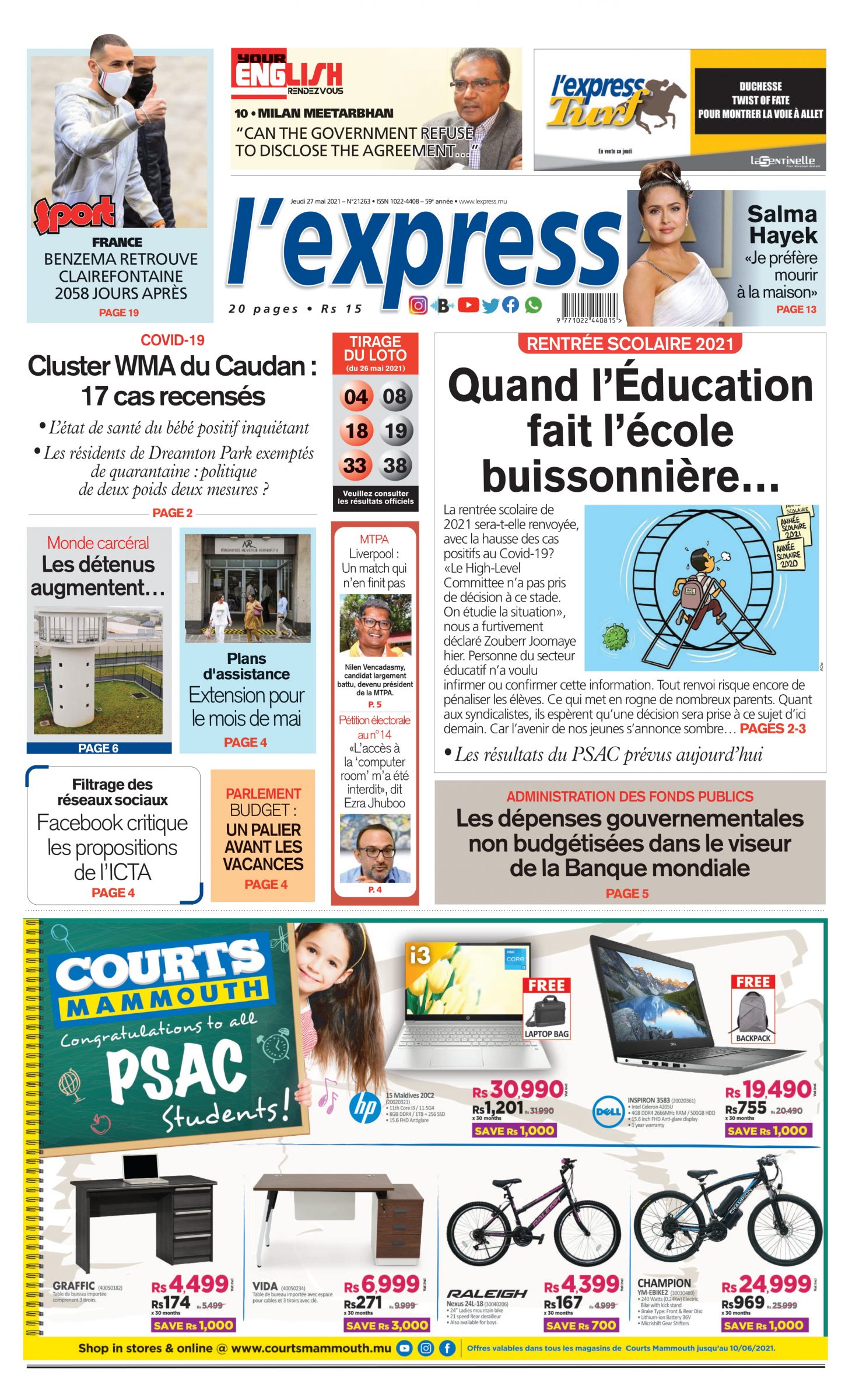 En une de l'express : Quand l’Éducation fait l’école buissonnière… ; Autre titre: Budget 2021-22: un palier avant les vacances…