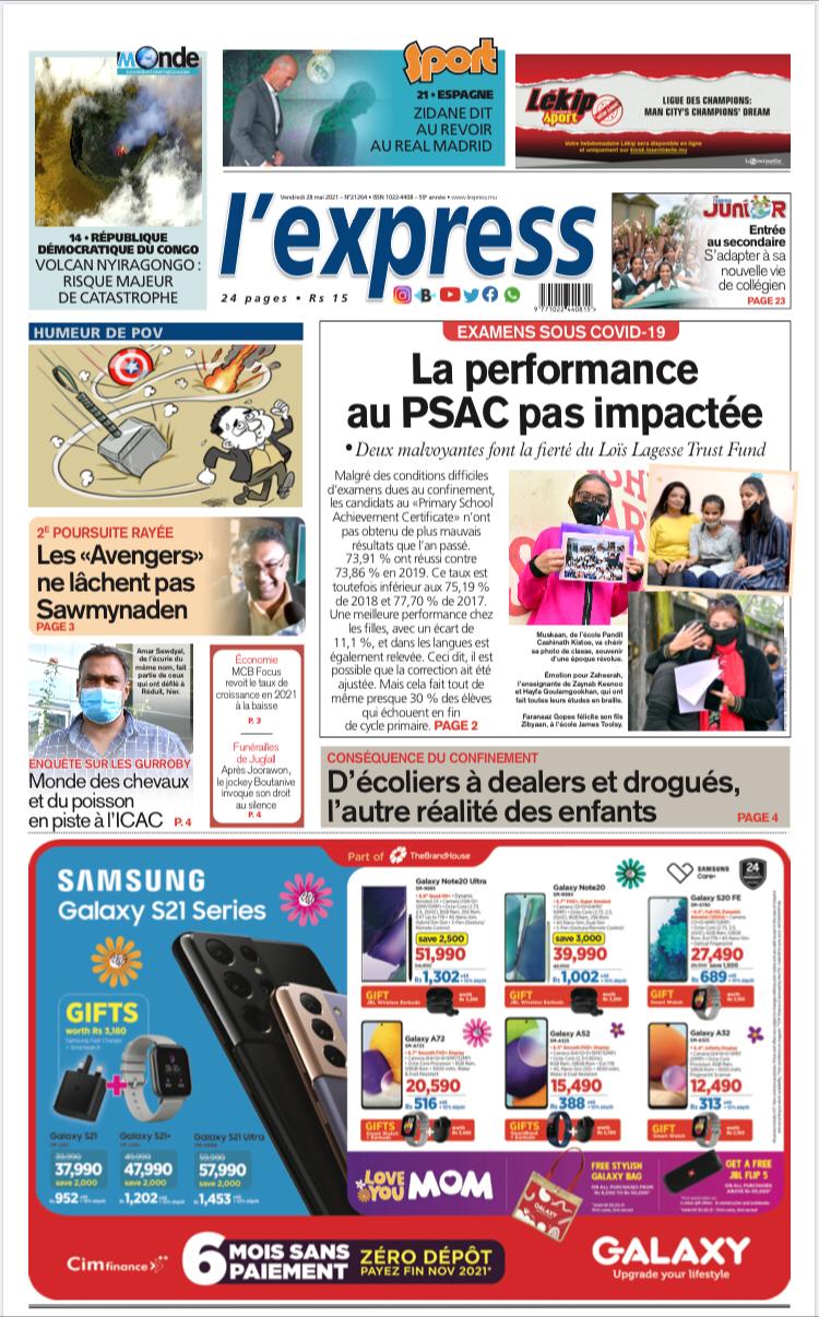 En une de l'express: Examens sous Covid-19: La performance au PSAC pas impactée; Autre titre: Conséquence du confinement: D’écoliers à dealers et drogués, l’autre réalité des enfants.