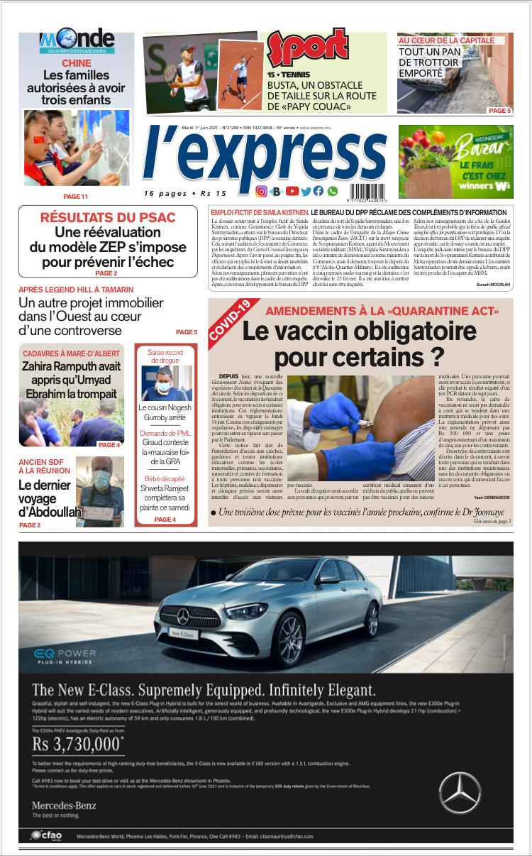 En une de l'express: Covid-19 : Amendements à la «Quarantine Act»: Le vaccin obligatoire pour certains ?; Autre titre: Emploi fictif de Simla Kistnen: le bureau du DPP réclame des compléments d’information.